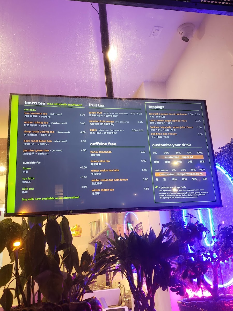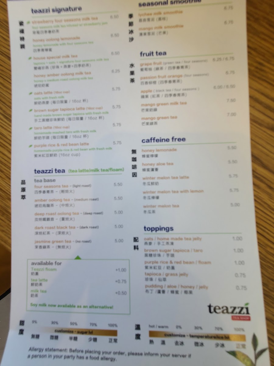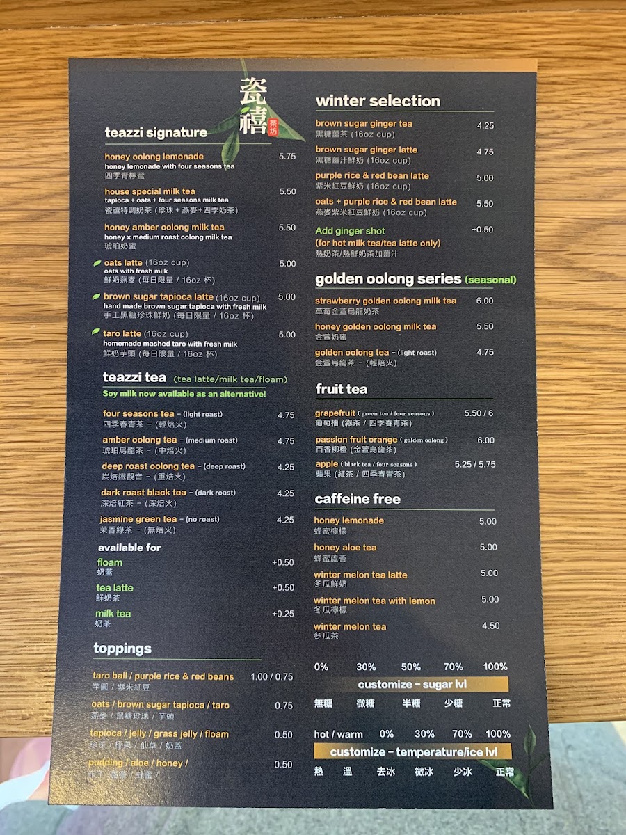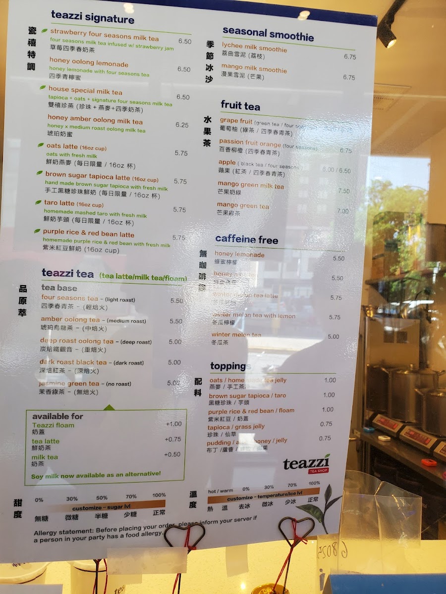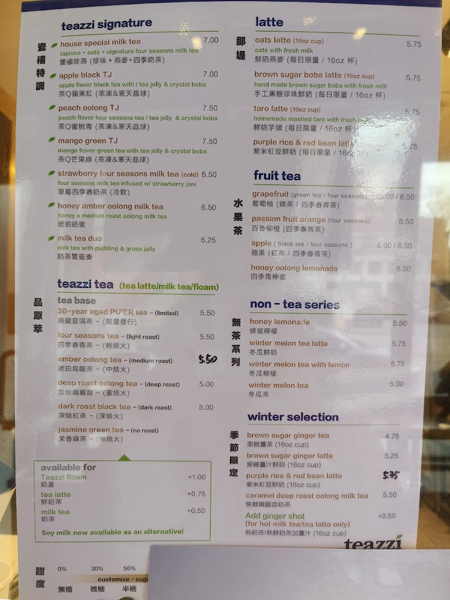 Teazzi Tea Shop offers a diverse and intriguing menu with a range of specialty beverages to suit all tastes. The Teazzi Signature section features unique combinations like the House Special Milk Tea 雙禧珍燕 and the refreshing Peach Four Seasons Fushion 茶凍蜜桃青, priced at $4.50. For those looking for something more indulgent, the Honey Amber Oolong Milk Tea 琥珀奶蜜 is a popular choice at $5.00. The New Arrival menu introduces exciting options such as the Velvet Oolong Milk Tea Wsesame Peanut Mochi 絲絨雙糯 and the decadent Brown Sugar Boba Latte 手工黑糖珍珠鮮奶 for $5.50. The Fruit Tea offerings include the vibrant Passion Fruit Orange Four Seasons Tea 百香柳橙四季春 and Mango Green Tea 芒果綠茶, both priced at $5.00. Milk tea lovers can enjoy a variety of classic options, from the Four Seasons Oolong Milk Tea 四季春青奶茶 to the exotic Jasmine Green Milk Tea 茉香奶綠, each priced around $4.50. The Teazzi Tea selection features pure teas like the Amber Oolong Tea 琥珀烏龍茶 and Ruby Oolong Tea 紅水烏龍茶. For those seeking dairy-free alternatives, the Oat Milk Tea 燕麥奶奶茶 section includes flavors like the Four Seasons Oat Milk Tea Latte 四季春燕麥奶茶 at $5.00. The Noncaffeinated menu offers soothing drinks such as the Winter Melon Tea Latte 冬瓜鮮奶 for $4.50. Additionally, the shop features indulgent lattes like the Shizuoka Matcha Latte 翠玉雲抹鮮奶 and the Purple Rice And Red Bean Latte 紫米紅豆那堤, perfect for those with a sweet tooth. For a keepsake, the Teazzi Merchant section offers Teazzi Mugs 馬克杯 and Teazzi Gift Box Sets 限量禮品盒. Whether you're after something refreshing, indulgent, or non-caffeinated, Teazzi Tea Shop has something for everyone to enjoy.