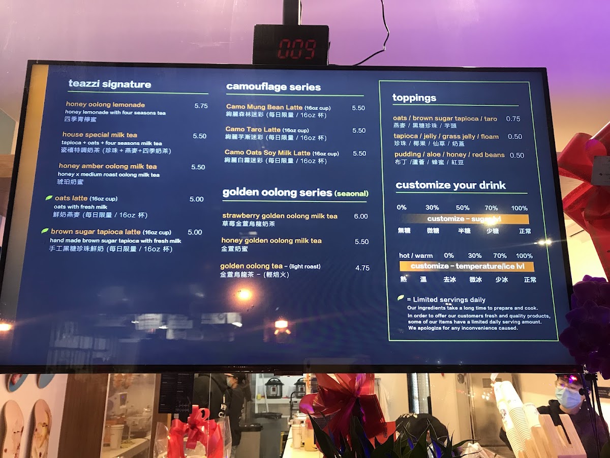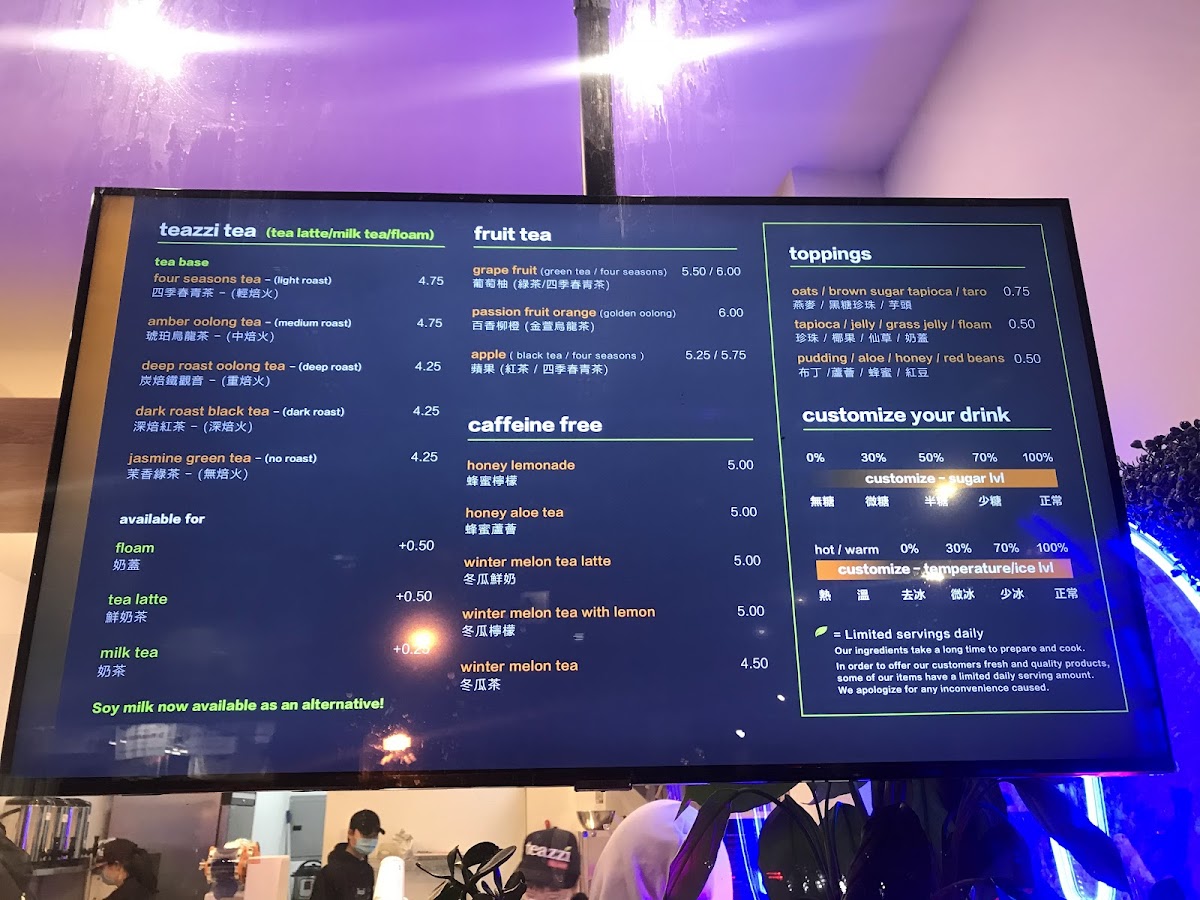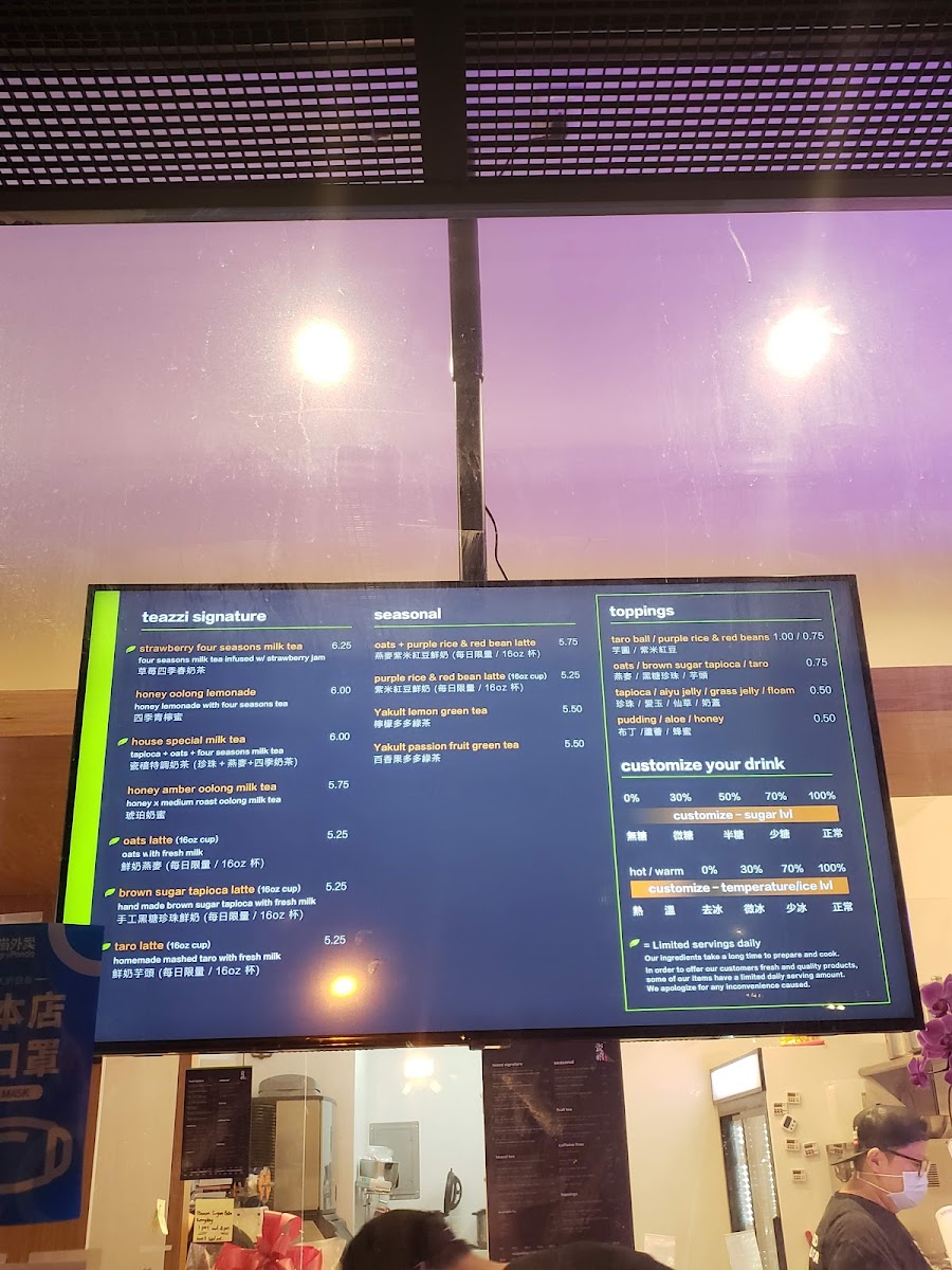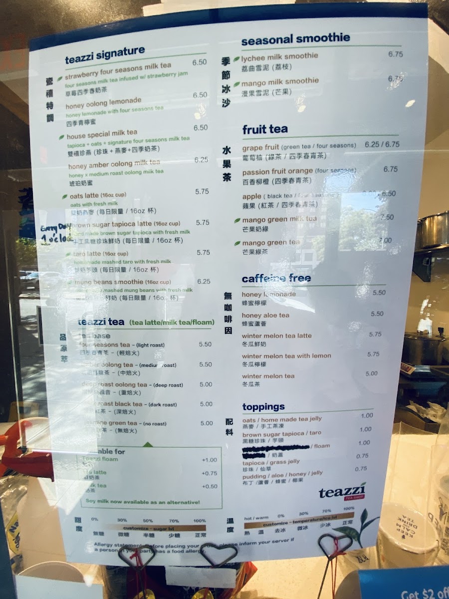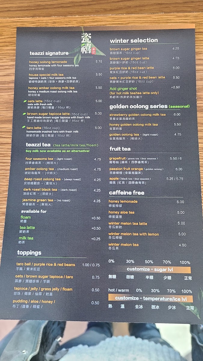 Teazzi Tea Shop offers a diverse and intriguing menu with a range of specialty beverages to suit all tastes. The Teazzi Signature section features unique combinations like the House Special Milk Tea 雙禧珍燕 and the refreshing Peach Four Seasons Fushion 茶凍蜜桃青, priced at $4.50. For those looking for something more indulgent, the Honey Amber Oolong Milk Tea 琥珀奶蜜 is a popular choice at $5.00. The New Arrival menu introduces exciting options such as the Velvet Oolong Milk Tea Wsesame Peanut Mochi 絲絨雙糯 and the decadent Brown Sugar Boba Latte 手工黑糖珍珠鮮奶 for $5.50. The Fruit Tea offerings include the vibrant Passion Fruit Orange Four Seasons Tea 百香柳橙四季春 and Mango Green Tea 芒果綠茶, both priced at $5.00. Milk tea lovers can enjoy a variety of classic options, from the Four Seasons Oolong Milk Tea 四季春青奶茶 to the exotic Jasmine Green Milk Tea 茉香奶綠, each priced around $4.50. The Teazzi Tea selection features pure teas like the Amber Oolong Tea 琥珀烏龍茶 and Ruby Oolong Tea 紅水烏龍茶. For those seeking dairy-free alternatives, the Oat Milk Tea 燕麥奶奶茶 section includes flavors like the Four Seasons Oat Milk Tea Latte 四季春燕麥奶茶 at $5.00. The Noncaffeinated menu offers soothing drinks such as the Winter Melon Tea Latte 冬瓜鮮奶 for $4.50. Additionally, the shop features indulgent lattes like the Shizuoka Matcha Latte 翠玉雲抹鮮奶 and the Purple Rice And Red Bean Latte 紫米紅豆那堤, perfect for those with a sweet tooth. For a keepsake, the Teazzi Merchant section offers Teazzi Mugs 馬克杯 and Teazzi Gift Box Sets 限量禮品盒. Whether you're after something refreshing, indulgent, or non-caffeinated, Teazzi Tea Shop has something for everyone to enjoy.